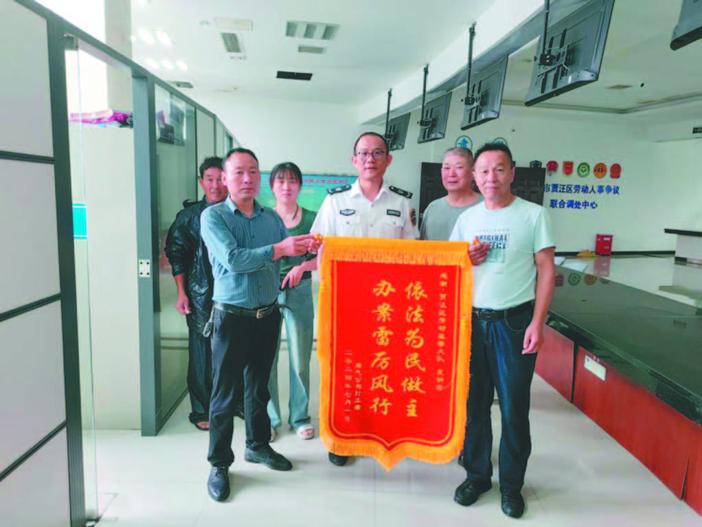 近日,5位农民工向徐州市贾汪区劳动争议调处联合中心赠送了一面写着“依法为民做主、办案雷厉风行”的锦旗,以表达感谢之情。