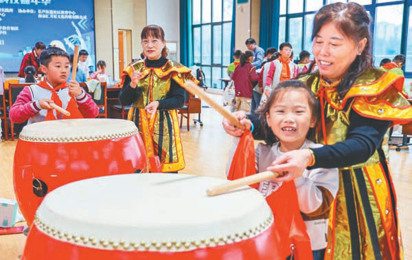 南京江北新区长芦街道定期邀请辖区内的中小学生开展书法撰写、诗词欣赏、非遗文化传承等丰富多彩的文化活动,让孩子们在放松身心的同时提高文化自信和民族自豪感。图为孩子们在敲响留左大鼓的过程中领略非物质文化遗产的独特魅力。