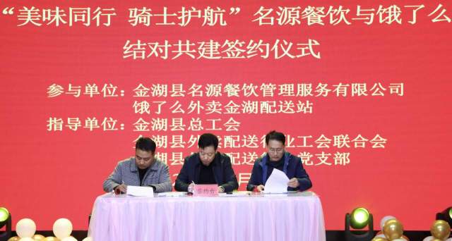 活动现场,该县名源餐饮有限公司与饿了么外卖金湖配送站开展结对共建并签订合作协议。县名源餐饮有限公司承诺为饿了么提供三项服务,凡是饿了么员工,蓝骑士到我们公司下设的门店就餐享受85折优惠;凡是蓝骑士员工到我们名源餐饮旗下门店过生日,享受头等舱服务;凡是蓝骑士员工到名流餐饮吃工作餐,享受5.5折优惠。