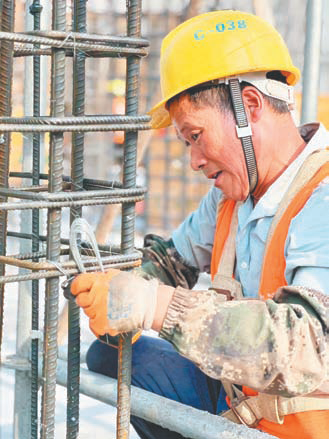 钢筋工王林正在绑扎钢筋。 刘成 摄