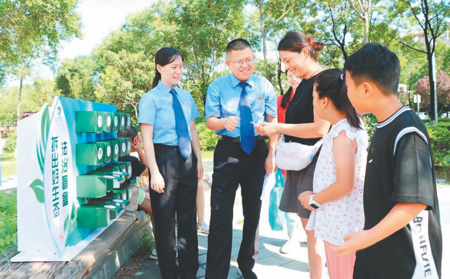 近日,徐州市云龙区检察院联合云龙区司法局等部门开展法治游园会活动,宣传生态环保法律知识。图为检察官与参加活动的群众一起拆看“法治盲盒”。