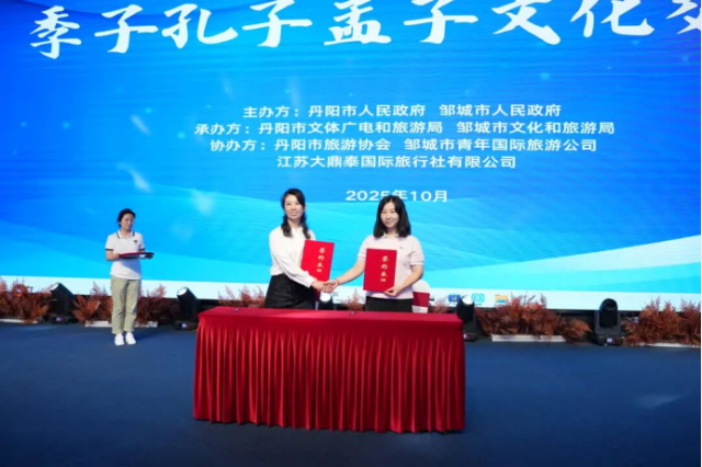 在现场嘉宾的共同见证下,丹阳延陵季子庙与邹城孟庙正式签约结盟,标志着两地圣贤文化的传承保护进入协同发展新阶段。同时,江苏大鼎泰国际旅行社与邹城市青年国际旅游公司签署客源互送协议,为两地市民互访搭建起便捷桥梁。在随后举行的赠书仪式上,丹阳向邹城赠送了《漫游丹阳》等地方文化书籍,生动展示了我市深厚的历史文化底蕴。