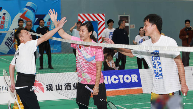 比赛当天,羽毛球世界冠军汤金华到场助威,并且打了一场趣味表演赛。此前几届,汤金华都是站在媒体冠军队的对面,今年,当“无限极杯”遇上记者节,汤金华终于不再和媒体“作对”,而是和媒体站在了“同一战壕”,她率领媒体组冠军“江苏广电一队”和嘉宾组冠军“养固健队”打了一场趣味赛,最终仅以1分险胜。