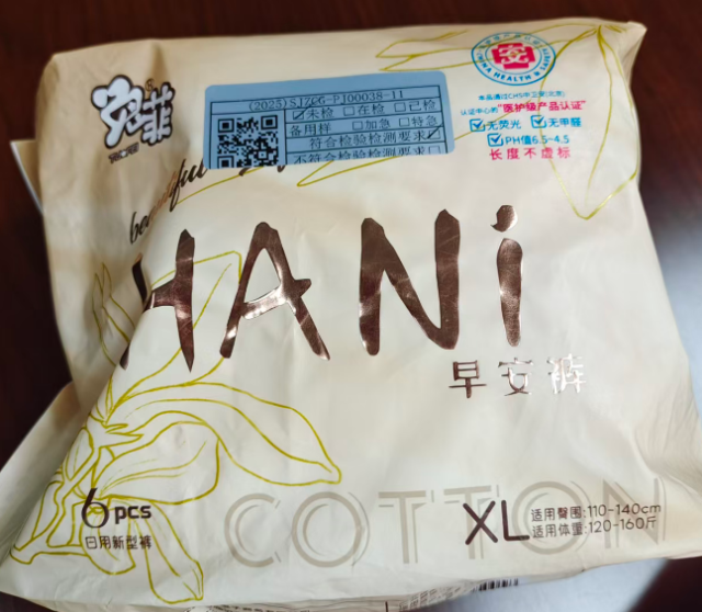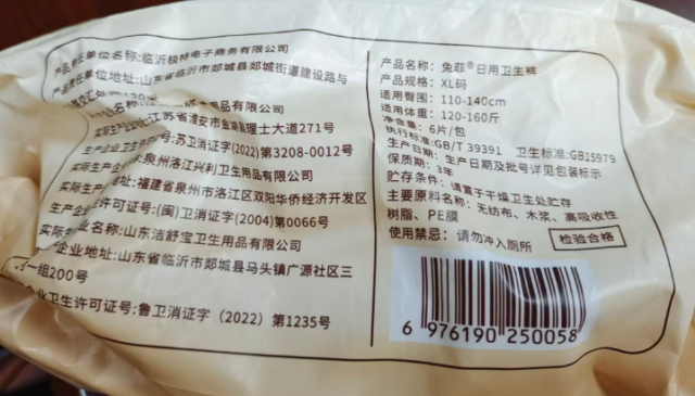 40批次产品外观包装均符合标准要求,但部分产品标签标识存在不规范情况。其中,“兔菲®日用卫生裤”适用腰围最大值实测109cm,低于其标注尺码加大码(XL)对应的标准要求(≥115cm),可能造成腰围处过紧,影响使用体验。