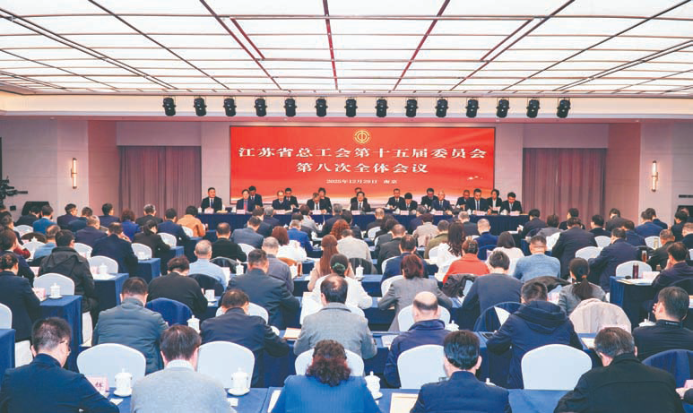本报讯(记者 王鑫)12月29日,江苏省总工会第十五届委员会第八次全体会议在宁召开。全会深入学习贯彻党的二十届四中全会精神,认真落实省委十四届十次全会要求,按照省委和全总工作部署,总结2025年以来工作,部署2026年任务,作出《关于充分发挥工人阶级主力军和工会组织桥梁纽带作用 为“十五五”时期中国式现代化江苏新实践凝聚智慧力量的决定》,进一步激发全省职工群众团结奋进的磅礴力量,为推动中国式现代化江苏新实践取得新的更大进展作出积极贡献。省人大常委会副主任、省总工会主席魏国强代表省总工会常委会作工作报告,省总工会党组书记、副主席刘月科主持会议。