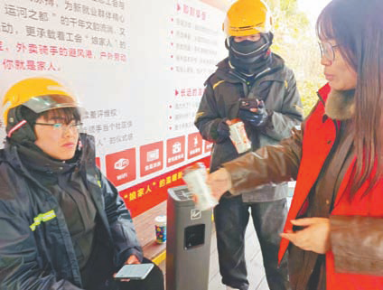 雪后的淮安寒风刺骨,气温骤降。淮安区总工会志愿者纷纷走向街头,将一杯杯热气腾腾的奶茶和热水送到环卫工人、外卖骑手、快递小哥等劳动者手中,带去“娘家人”的一份关爱和温暖 。