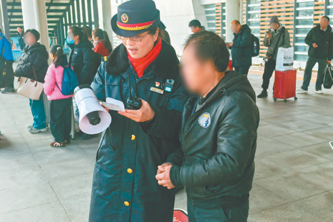 李炎艳所在班组共有13个人。春运期间,客流量翻倍,每人每天的步数突破2万步是常态。“今天是大年初一,客流比前几天少一些,但是和平常相比还是增长的。”交接班完成后,李炎艳开始各个岗位的巡视工作。正值列车即将检票,检票口前排起长队,李炎艳拿起扩音器,走到人群中开始维持秩序,引导乘客有序排队,她的声音清晰而洪亮,在嘈杂的候车大厅里格外清晰。