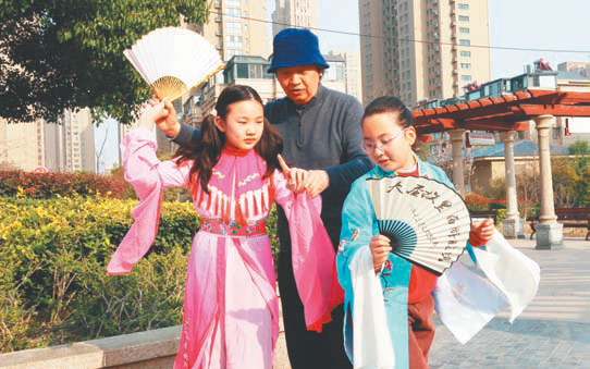 3月25日,连云港市海州区,小朋友在专业京剧演员指导下练习戏曲表演基本造型,学习戏剧文化知识,感受中国传统戏曲文化的魅力,共同迎接3月27日第65个世界戏剧日。