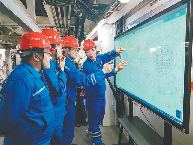 职工创新工作室青年职工在江阴靖江长江隧道施工现场。