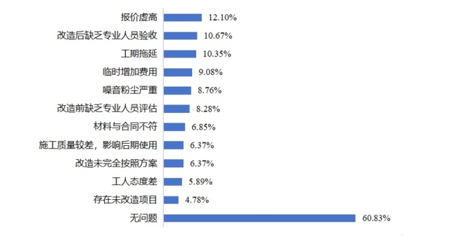 同时,企业在收费、工期、质量等方面仍存在问题。在进行过居家适老化改造的老年人家庭中,近四成在施工过程中遇到过问题,主要集中在费用、人员专业性、合同执行情况等方面。前三大问题依次为:报价虚高、改造后缺乏专业人员验收、工期拖延,占比均超过10%。