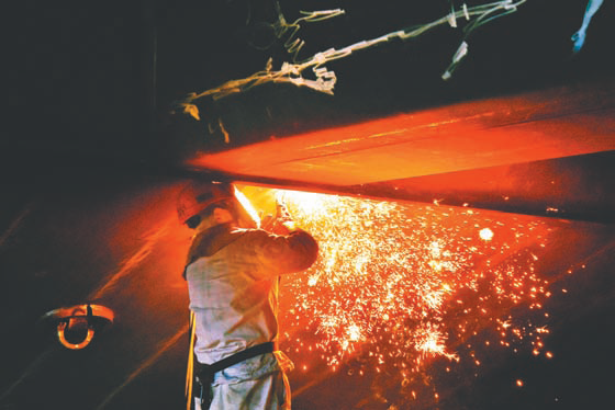 2/2时值年末,位于如皋市长江镇的江苏海通海洋工程装备有限公司开足马力,船坞内外一片生产繁忙景象,工人们抓紧建造船舶订单。2024年,企业找准推动高技术船舶与海工装备产业发展赛道,在绿色化、数字化、智能化赋能转型下,造船完工量、新接订单量、手持订单量全面增长。1月至11月份交付新船7艘,目前在手订单34艘,交付日期己排至2028年。图为2024年12月25日江苏海通海洋工程装备有限公司船舶生产场景。 吴树建 摄