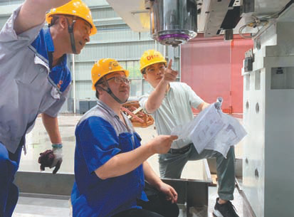 近日,盐城市亭湖区总工会组织劳模工匠走进企业开展“劳模工匠助企行”活动,通过技术帮扶和技术培训,助力职工成长、企业创新,彰显劳模工匠示范作用与工会担当。图为全国劳模、江苏工匠陈跃在江苏高和智能装备股份有限公司车间与工人一起研讨解决生产中的技术难题。 姜卫明 摄
