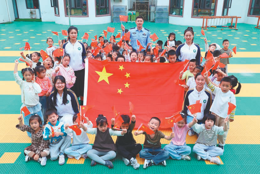 1/3国庆来临之际,江苏矿业巴州分公司(新疆)开展“我与国旗合个影”为祖国送祝福活动,在大漠里的采油井台,让石油红和鲜艳国旗同框映照,庆祝中华人民共和国成立76周年。 周先贵 摄9月28日,南钢集团举行升旗仪式,南钢老中青三代人面对国旗,用庄严的仪式感迎接国庆、中秋“双节”,共抒爱国爱厂之情。吴斌 摄9月25日,宿迁市宿城区双庄街道康庭名苑幼儿园,民警和师生与国旗合影,喜迎国庆节的到来。王力 摄