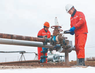 2/2随着一轮冷空气的到来,江苏矿业巴州分公司所在新疆大漠边缘的塔河工区,出现降雪和雾凇。矿业职工迎寒而上,坚守岗位“保安全、促生产、守运行”,图为采油二大队职工在雪中巡井,对井口阀门进行保养维护。 吴奇杰 周先贵 摄