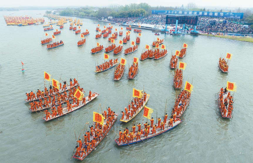 1/14月6日,2026年泰州姜堰溱潼会船节在泰州市姜堰区溱湖国家湿地公园开幕,数百条各式各样的船只和上万名会船选手云集溱湖,飞篙走桨,奋勇争先,“天下会船数溱潼,溱潼会船甲天下。”溱潼会船又名清明会,自南宋相沿至今,历经数百年传承,被列入国家级非物质文化遗产名录,是国内保存最为完整、最具原生态特质的水上庙会。汤德宏 摄